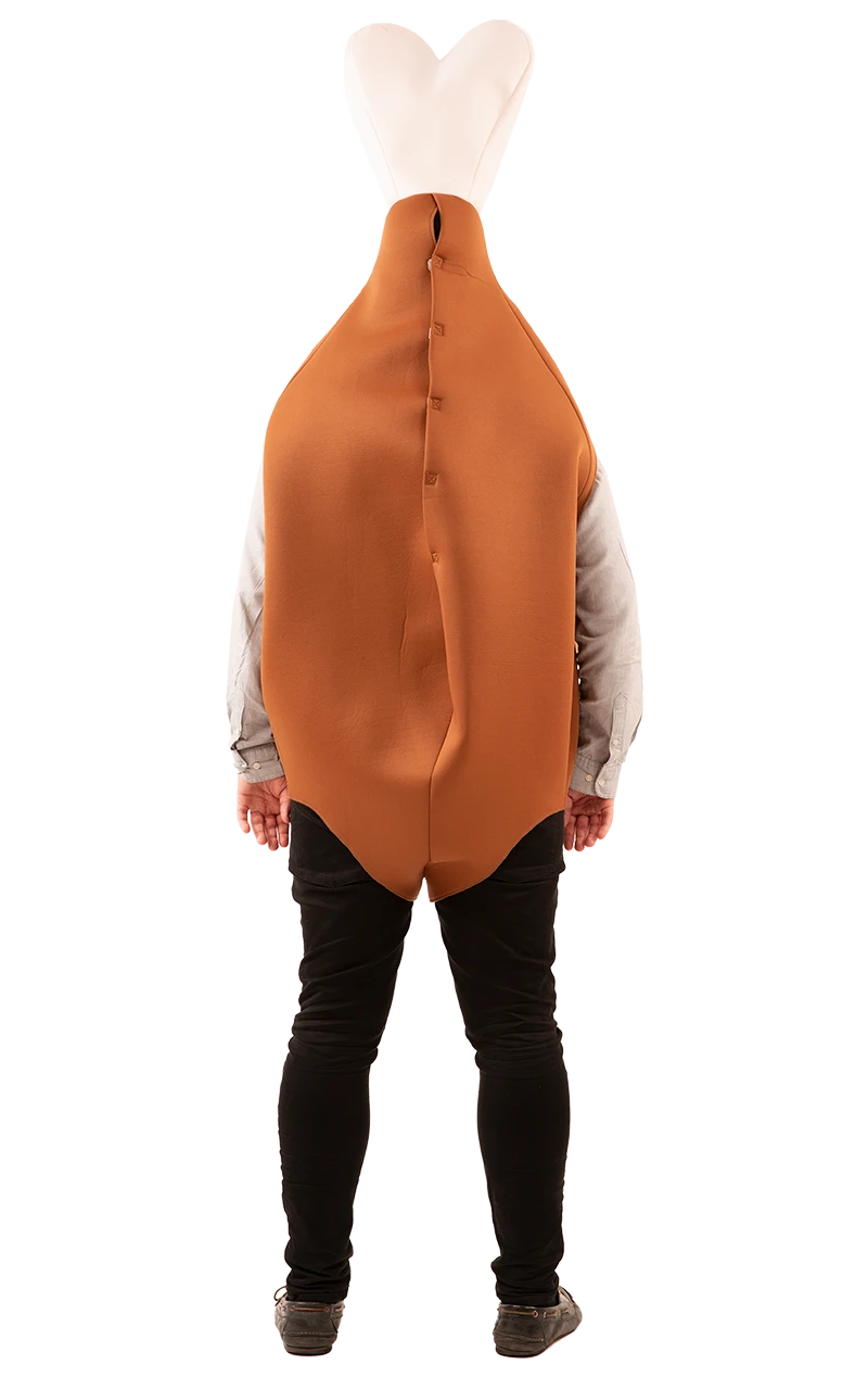 The Adult Chicken Drumstick Costume includes a tunic in the shape of a large chicken drumstick, with a hole for the face. Just add some padding for extra meaty goodness!