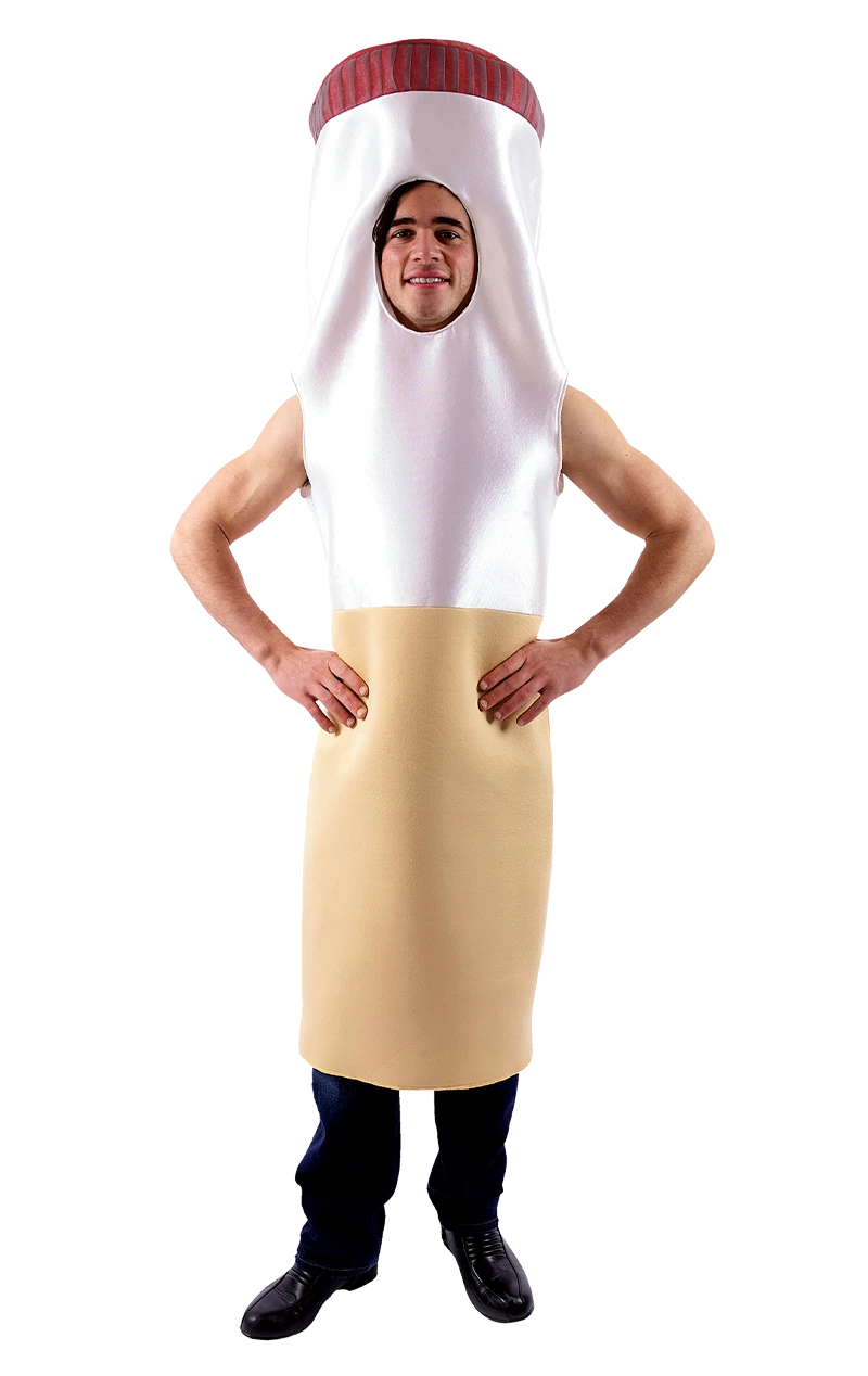 The Adult Smoking Cigarette Costume is made up of an all-in-one bodysuit with cut outs at either side for the arms, plus a hole for the face. The bodysuit is in the shape of a gigantic cigarette so nobody will miss you as you parade into the party.