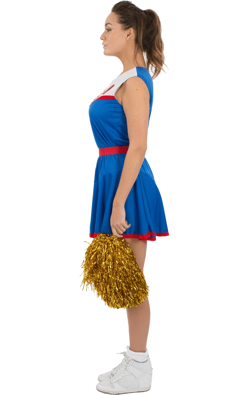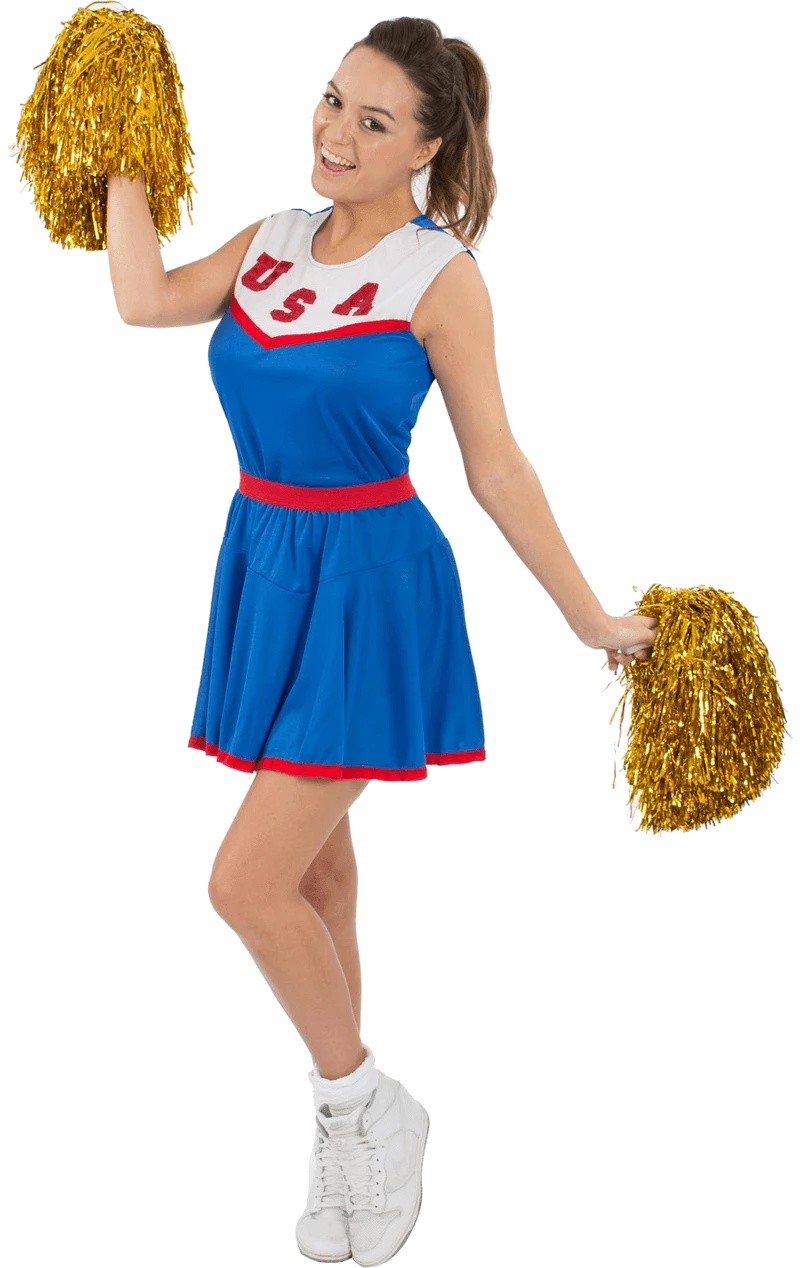 The Adult USA Cheerleader Costume is made up of a vibrant blue skirt with a red trim. It also includes a matching blue top with white detailing across the chest, and a neckline with ‘USA’ printed in red. Adding some shimmer to your look is a pair of glistening gold tinsel pom poms, giving you everything you need to chant, cheer and inspire your team.