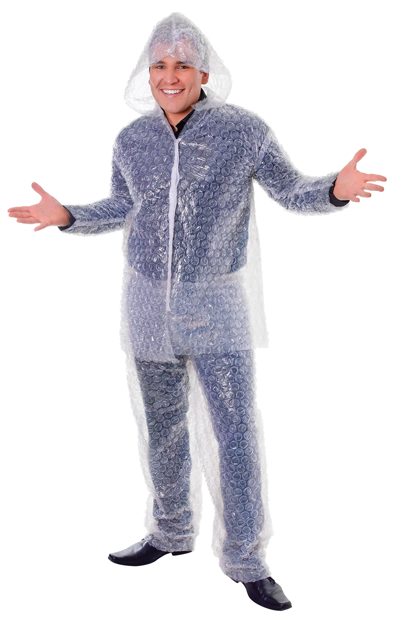 Our Bubble Wrap Suit Costume features a hooded long-sleeved jacket and a pair of trousers that are made from bubble wrap. The jacket has a zip at the front that you can either zip up or wear open. Be sure to pop on your own clothes underneath as to not catch anyone off guard!
