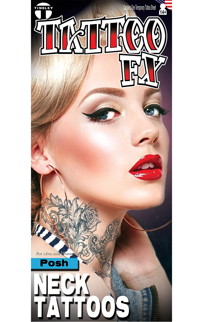 Get the pin-up, rockabilly girl look with this unique Dafacepiece Floral Neck Tattoo FX. Not all tattoos have to be big and scary, and you can fake it until you make it with this floral print and feminine neck fake tattoo.