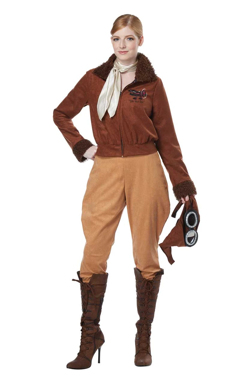 The Womens Amelia Earhart Aviator Costume comes complete with a leather-look bomber jacket with an illustration of a plane on the left-hand side. Also included are a pair of camel-coloured trousers, a beige-gold neck scarf, black and white goggles, and finally, a brown aviator hat.