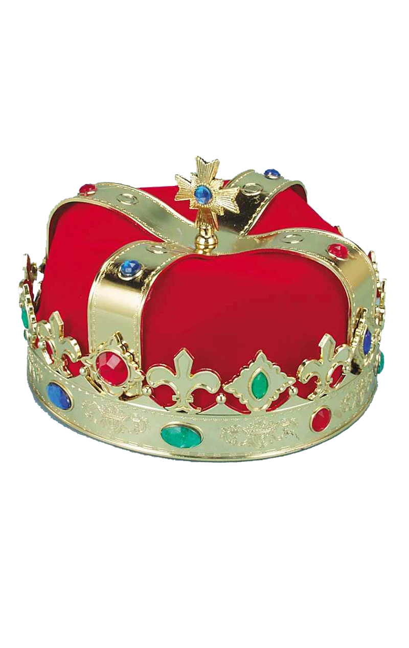 Golden plastic crown lined with a red velveteen fabric sprinkled with glitter and has inset with several multi coloured jewels.