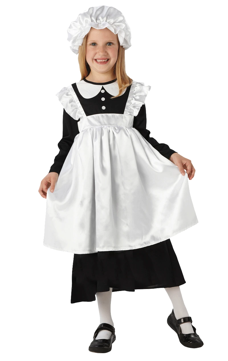 Our traditional Kids Victorian Maid Costume includes a black dress with attached white maids apron and printed blouse collar and button detailing. The back of the dress is plain black. A white mob cap is included to complete the look. It makes a perfect kids World Book Day costume or an authentic outfit for school Victorian themed days.