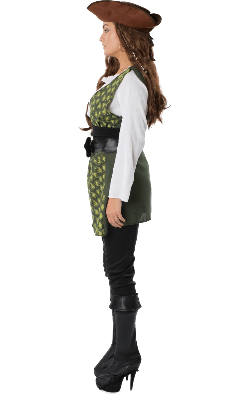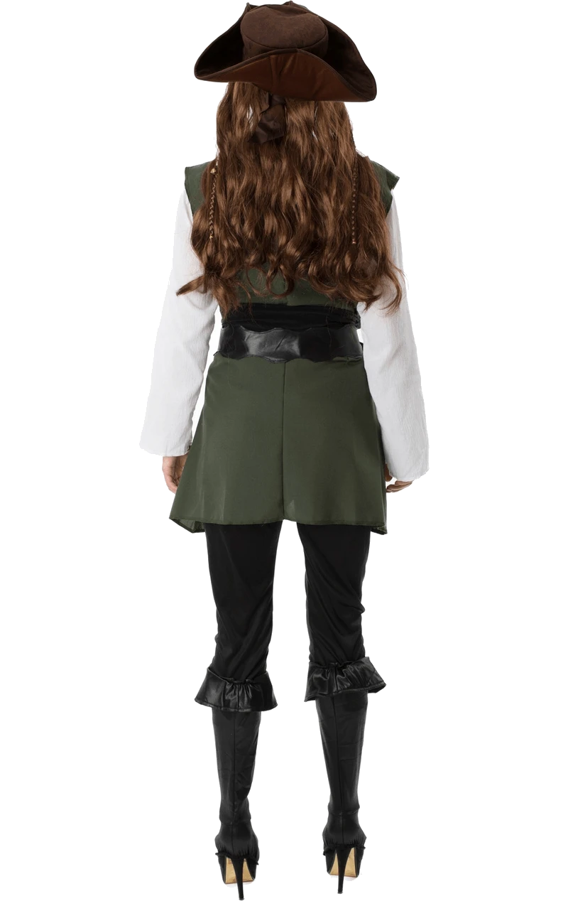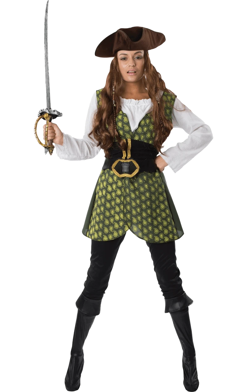 This Ladies Green Pirate Costume comes complete with a long white sleeve top with a ruffled neckline and a long green waistcoat that goes over the top. Also included are a pair of black trousers to keep you warm whilst at sea. To accessorise you out to the max, pop on our black waspie with gold detailing to show off your waist, our matching belt, black boot toppers, and finally, a brown pirate hat.
