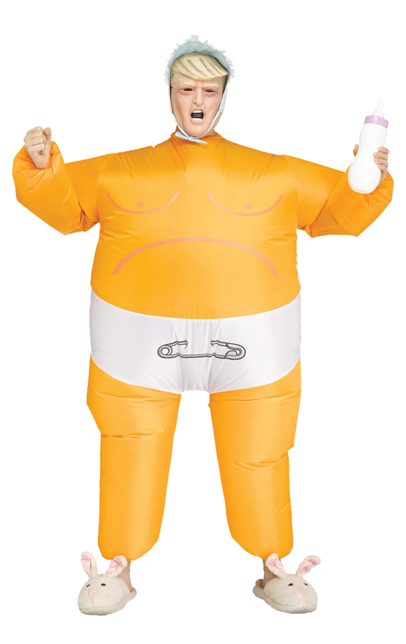 There’s a certain president that’s always in the news for throwing his toys out of the pram, so he’s been made into this spectacular costume! The Adult Inflatable Big Baby Trump Costume features a bright orange inflatable bodysuit with white nappy (or diaper!), a Trump facepiece with classic combover hair and a blue baby bonnet. The bright orange suit may look a bit odd, but this president is suspiciously sun-kissed, so it’s a feature that couldn’t be left out! This suit can inflate for up to 4+ hours and requires 4 AA batteries. Make fancy dress great again!