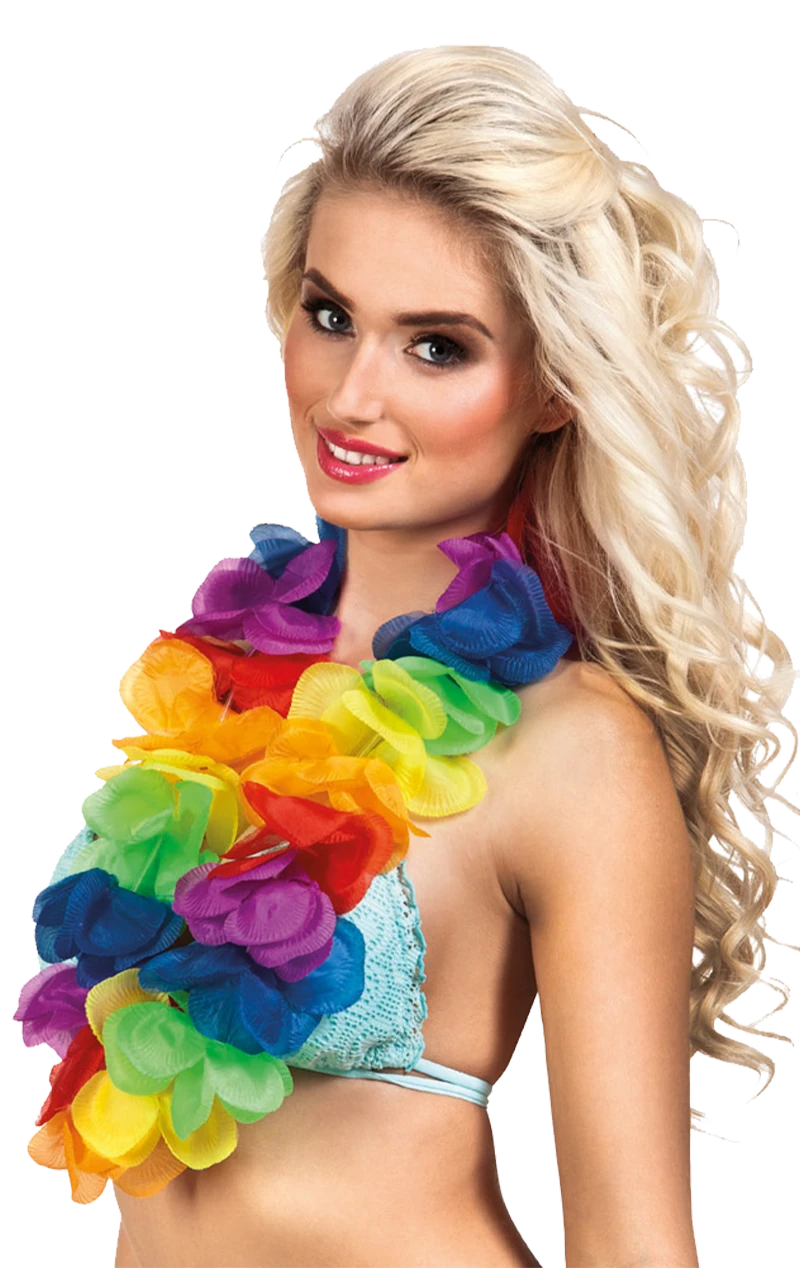 Become a Hawaiian goddess in this brightly coloured Multicoloured Rainbow Hawaiian Lei. Ideal for a Hawaiian theme at an around the world party or to help you celebrate Pride season, this flower garland sure is eye-catching!