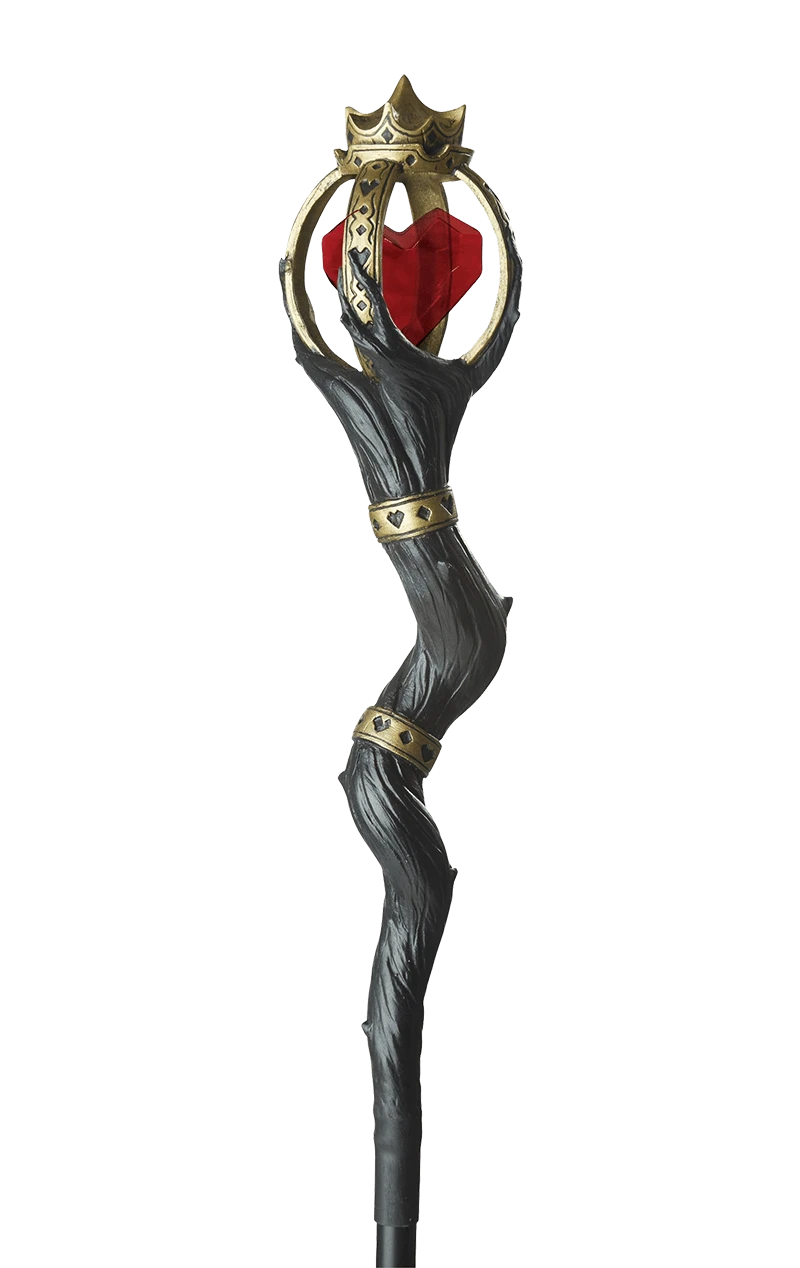 The Queen of Hearts Staff is a long, dark twisted staff with two gold bangle details, featuring a heart and diamond pattern. The top section of the staff, that acts at the handle, is a dome-like shape that features gold detailing and a red heart inside.