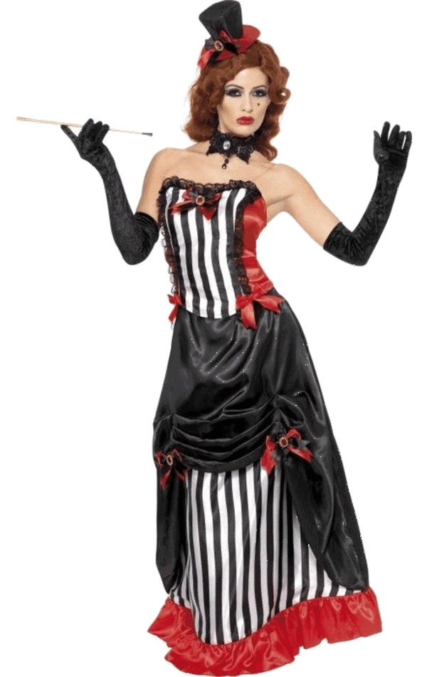 The Women’s Madame Vamp Costume is made up of a stunning floor length dress with a black and white striped skirt with a red trim, black overskirt, and decorative bows. The dress also features a matching corset style bodice in the same black and white striped design with a black lace trim and red bows and is held up by some clear straps for a secure comfortable fit. Completing the look is a matching red and black hat adorned with a coordinating bow to finish the costume perfectly.