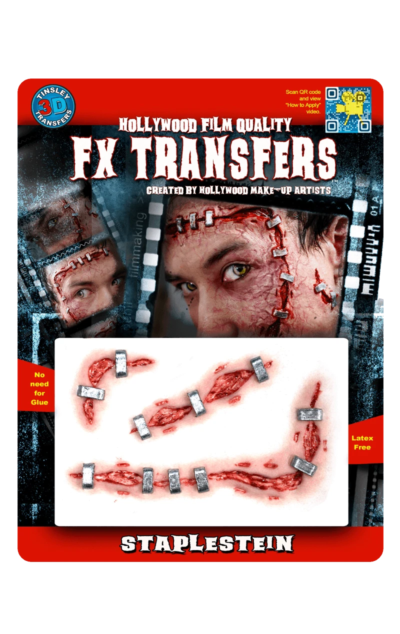 Perhaps you are a zombie who had a horror filled death or a mad inventor who decided to dissect himself! Whatever your unfortunate or psychotic tendencies this Halloween, give them this extra realistic look with the Staplestein 3D FX Transfers!