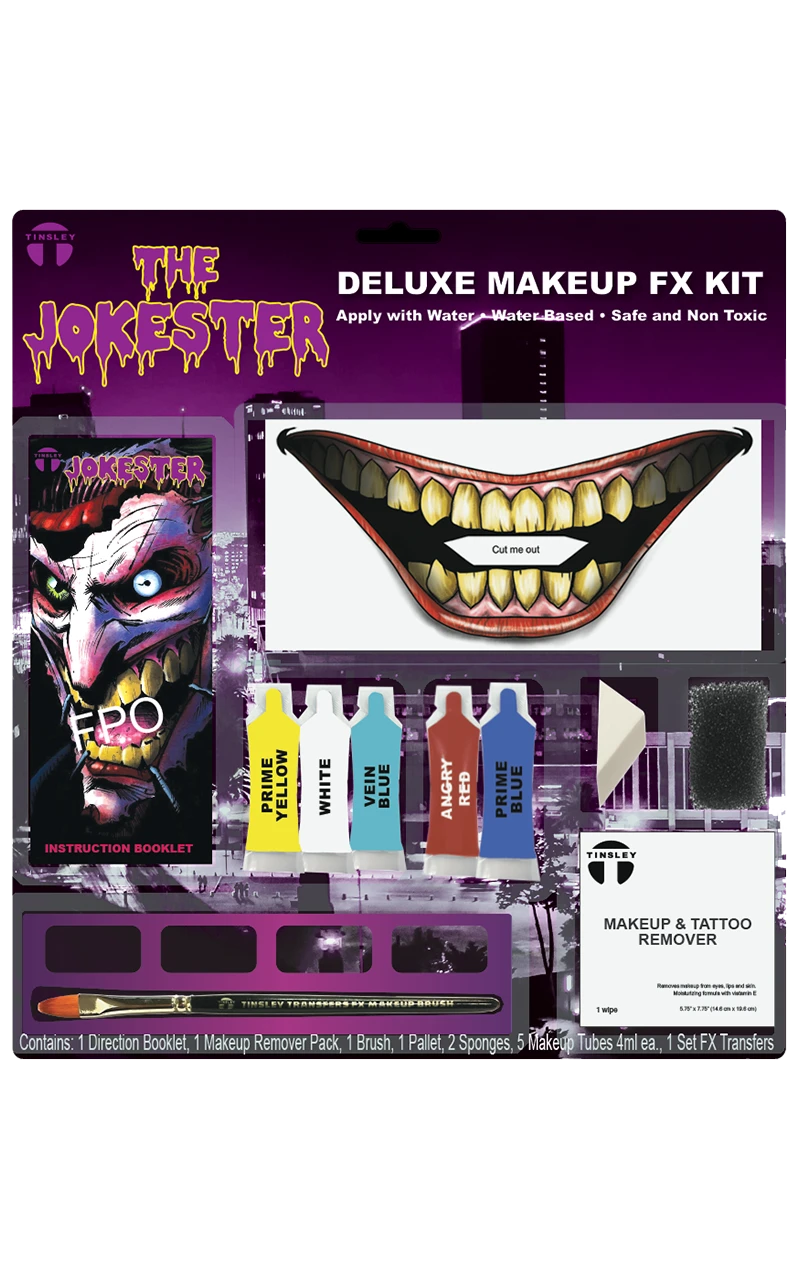 Get one of the wickedest grins in comic book history with The Jokester FX Makeup Kit. This makeup set features a face tattoo transfer in the style of DC Comics’ Joker. Look evil, up to no good and ever so smug as you create your very own Joker style, perfect for Comic-Cons, Halloween & Superhero Parties. The rest of the Gotham characters will be trembling at the party as you arrive in this one!
