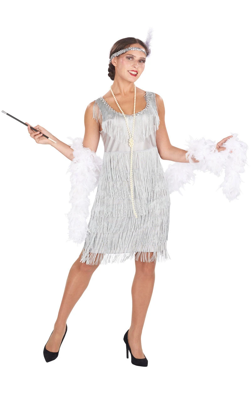The Womens 1920s Silver Flapper Costume is made up of an all-in-one silver flapper dress with an instantly recognisable twenties style. Hanging tassels drop down in layers, from the bodice and shoulders, all the way to the bottom of the dress. It sits comfortably at knee length so you can bust some moves and be comfortable at the same time. A matching silver headband with a feather is also included.