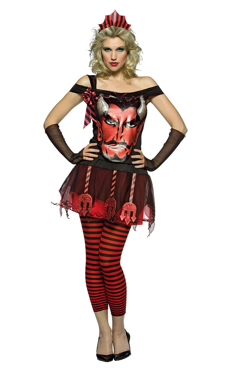 The Womens Halloween Devil Face Costume is made up of an off-the-shoulder black top with a large creepy devil face on the front, and a black and red striped ribbon on one side. The costume also includes a red skirt with a black tulle overlay and is finished with devil pitchforks and a pair of red and black striped leggings. Completing the look is a pair of black glovelettes and a black and red striped crown headdress. Everyone will know you are the Queen of hell!