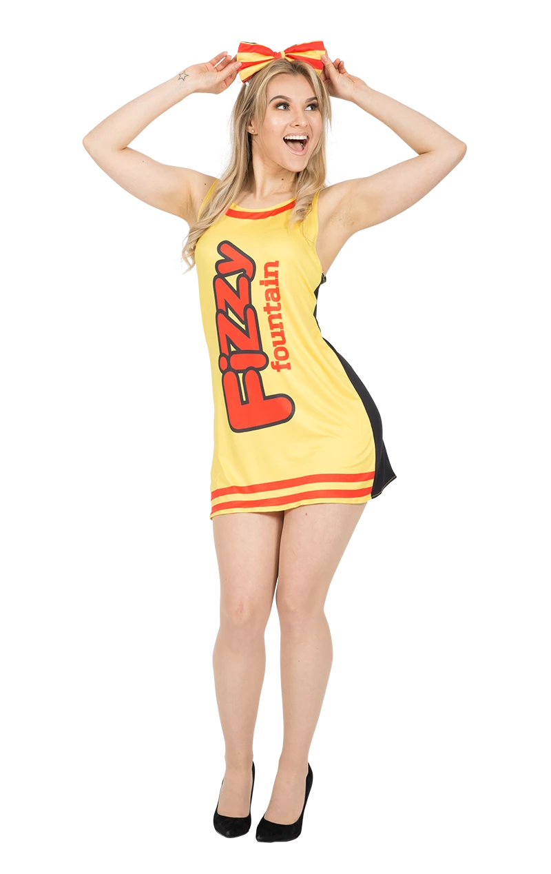 The Womens Sherbet Fountain Sweet Dress is made up of a figuring hugging vibrant yellow dress with red detailing around the top and two stripes running along the bottom. The front of the dress is printed with the famous sweet branding we all know and love from our childhood with the words ‘Fizzy Fountain’ in large in the centre. Sewn into the dress is a strip of elastic to pull you in at the waist so you can show off your fabulous figure. To complete the look is a headband with an attached striped yellow and red bow to give a retro stylish feel to the outfit.